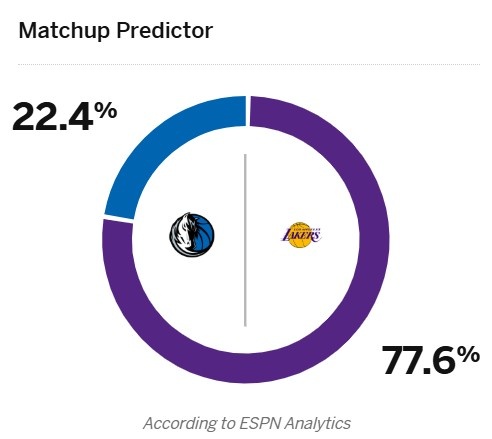ESPN预测了本场比赛胜率,其中主场作战的湖人胜率高达77.6%,独行侠为22.4%。