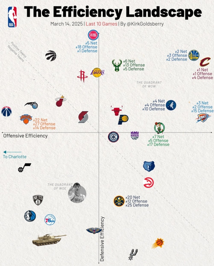 近10场攻防效率:骑士与活塞分别领衔攻防 勇士攻防均排名前三