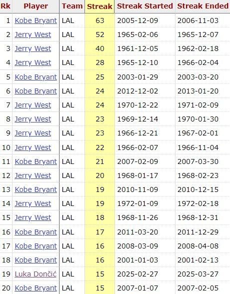 目前,东契奇已经连续15场比赛20+,为湖人队史第3位做到的后卫球员,此前两位是科比和杰里-韦斯特。