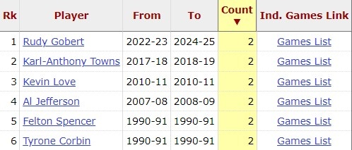 戈贝尔今天25板&10前场板 森林狼生涯第3次前场板上双 队史最多