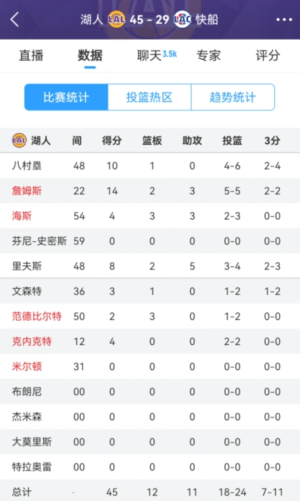 詹姆斯老当益壮21分&湖人全民皆兵 湖人半场轰73分领先快船23分