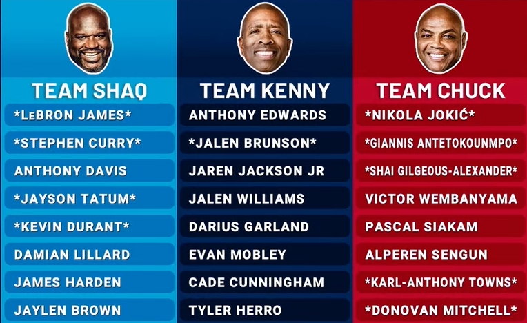 02月07日讯 TNT今日直播NBA全明星正赛选人,奥尼尔、肯尼和巴克利分成三队进行蛇形选人,不区分首发和替补。