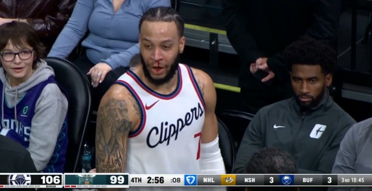 看着都疼!科菲接球顺下撞到防守球员摔倒 鼻血直流 2025/02/01