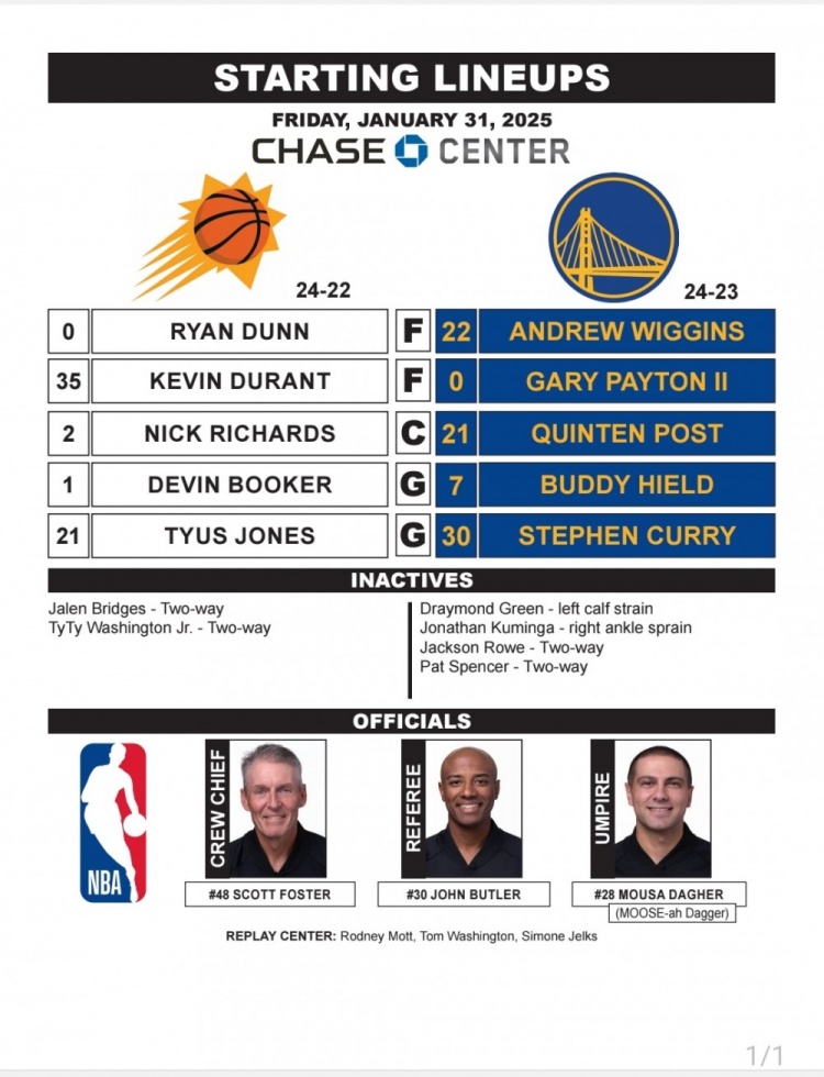 勇士对阵太阳首发:库里嘴哥齐出阵VS杜兰特布克组合 2月1日讯 今天中午11点,勇士将对阵太阳。赛前,双方公布首发阵容。勇士:维金斯、小佩顿、波斯特、希尔德、库里。太阳:邓恩、杜兰特、理查兹、布克、琼斯。主裁判是名哨福斯特。 2025/02/01