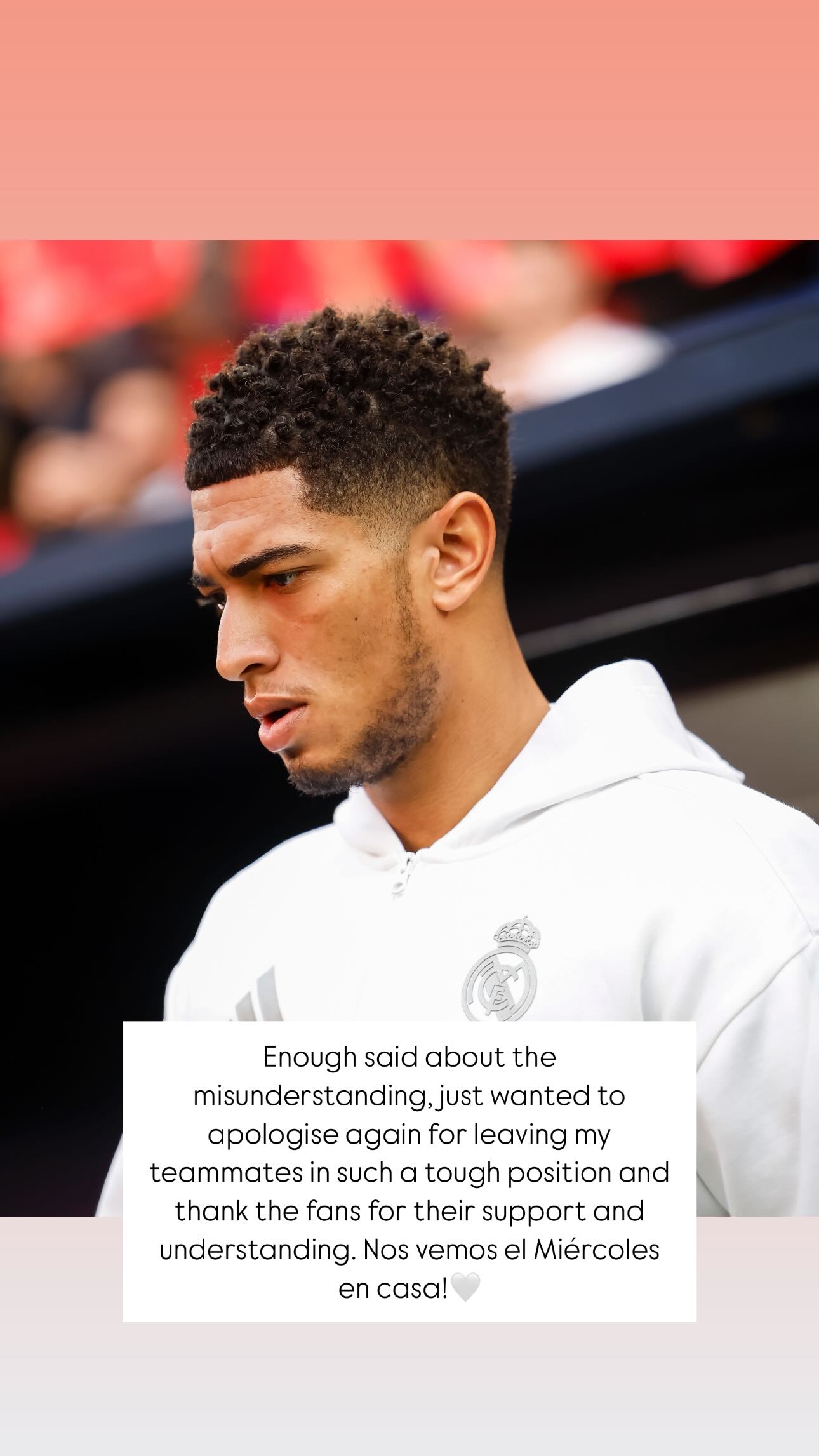 贝林厄姆:“关于这场误会,已经说得够多了,现在我只想再次为让队友们陷入如此艰难的境地而道歉, 也感谢球迷们的支持与理解。周三主场见(欧冠对阵曼城)!”