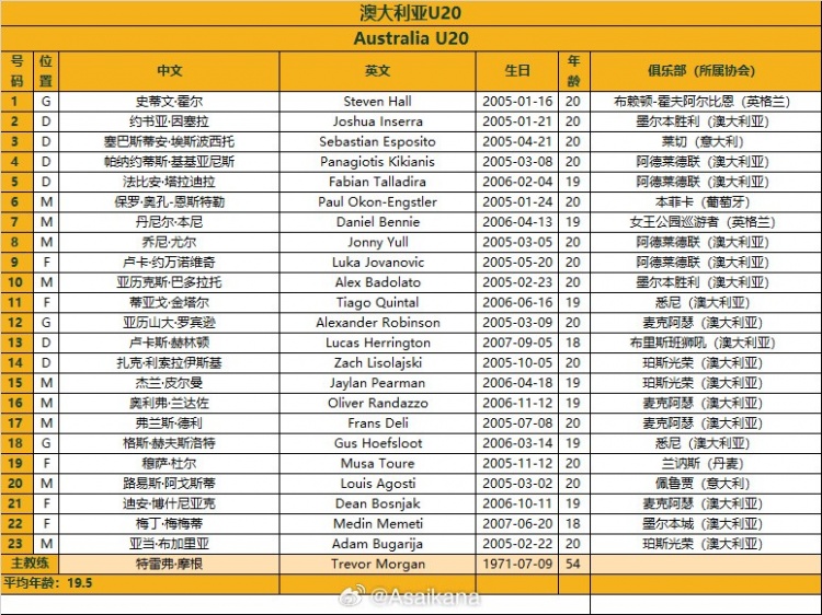 澳大利亚U20的23人名单如下图: