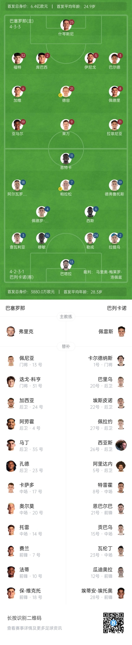 巴萨首发:25-什琴斯尼、2-库巴西、5-伊尼戈-马丁内斯、3-巴尔德、32-埃克托-福特、6-加维、21-德容、8-佩德里、11-拉菲尼亚、19-亚马尔、9-莱万多夫斯基