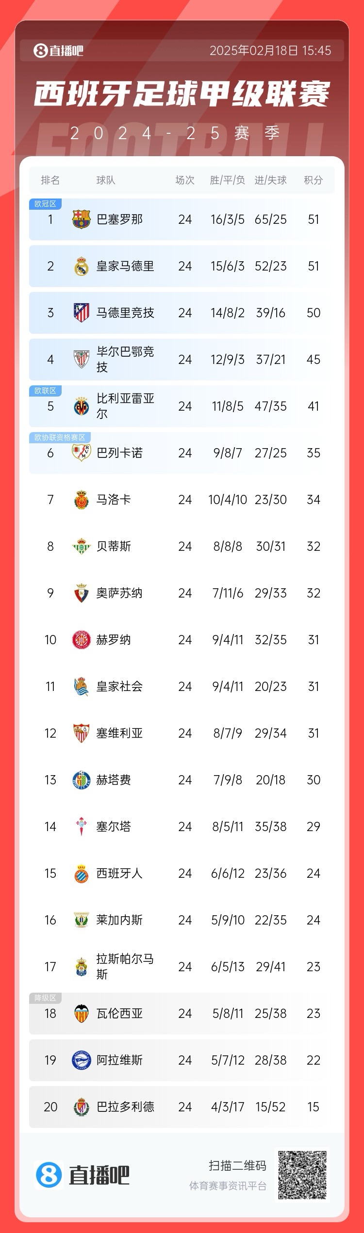 02月18日讯 本轮西甲巴萨1-0战胜巴列卡诺,目前和皇马同积51分,凭借净胜球优势领跑积分榜。