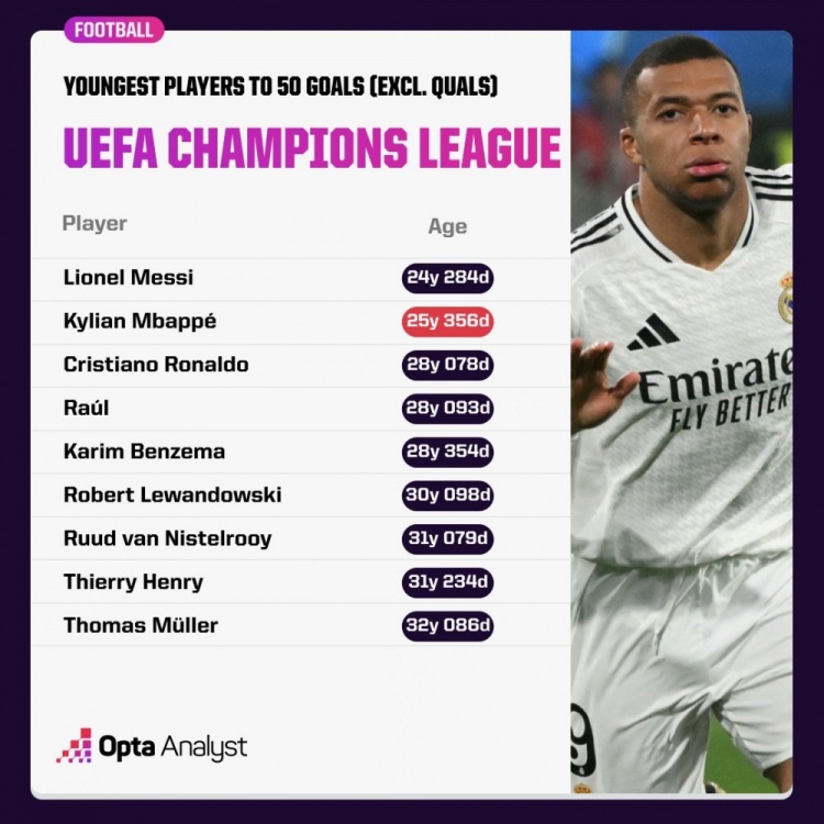 如果做到这一点,哈兰德将打破梅西(24岁284天)的纪录,并且压过姆巴佩和C罗等一众球星。