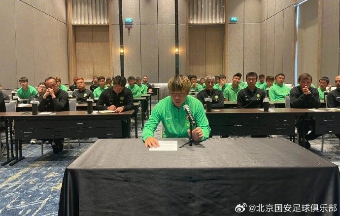 周金辉董事长的发言鼓舞了全队的士气,队长张稀哲随后代表全体队员发言,他说:“新教练组的到来重塑了我们的足球思维,起初或许有磨合的阵痛,但现在,我们清晰感受到——这支团队的心跳得更快、更齐了。我们也将在主教练的带领下,同心协力,一切以团队为先,集体为先。遵守队规,遵守赛风赛纪,坚守职业道德。身披绿色战袍的这些年,工体山呼海啸的呐喊早已刻进骨髓。我们记得球迷在场内坚毅又期待的目光,记得数以万计的的绿色围巾,更记得一次次场内tifo给予我们的力量。新赛季的倒计时已经响起!我们会像捍卫家门一样守护每一寸球场。没有保留,没有退路,唯有将每一分钟燃烧到极致——为了北京,为球迷,更为了我们的信仰,“国安永远争第一”!”