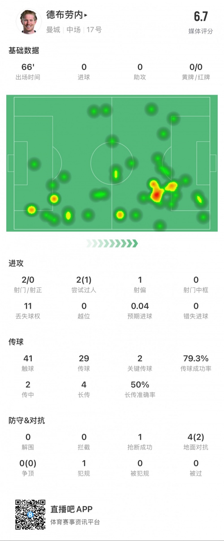 德布劳内本场数据:2次射门0次射正,2次关键传球,1次抢断