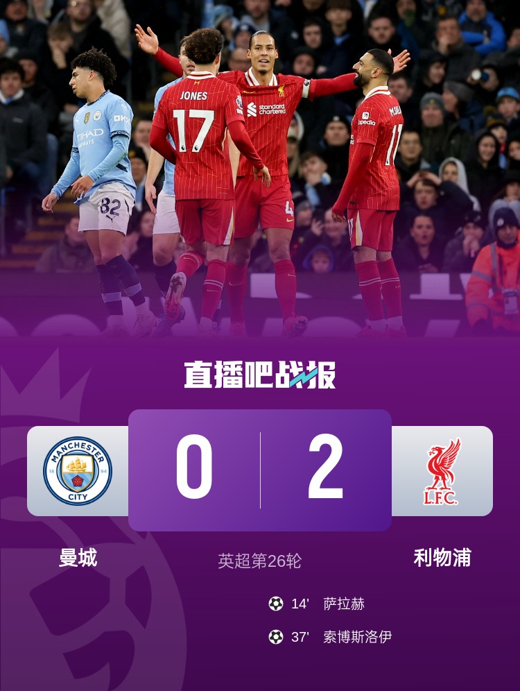 英超第26轮,利物浦2-0双杀曼城。上半场,刘易斯失误送角球致丢球,萨拉赫和索博斯洛伊互献传射,马尔穆什进球越位;下半场,琼斯进球越位在先。
