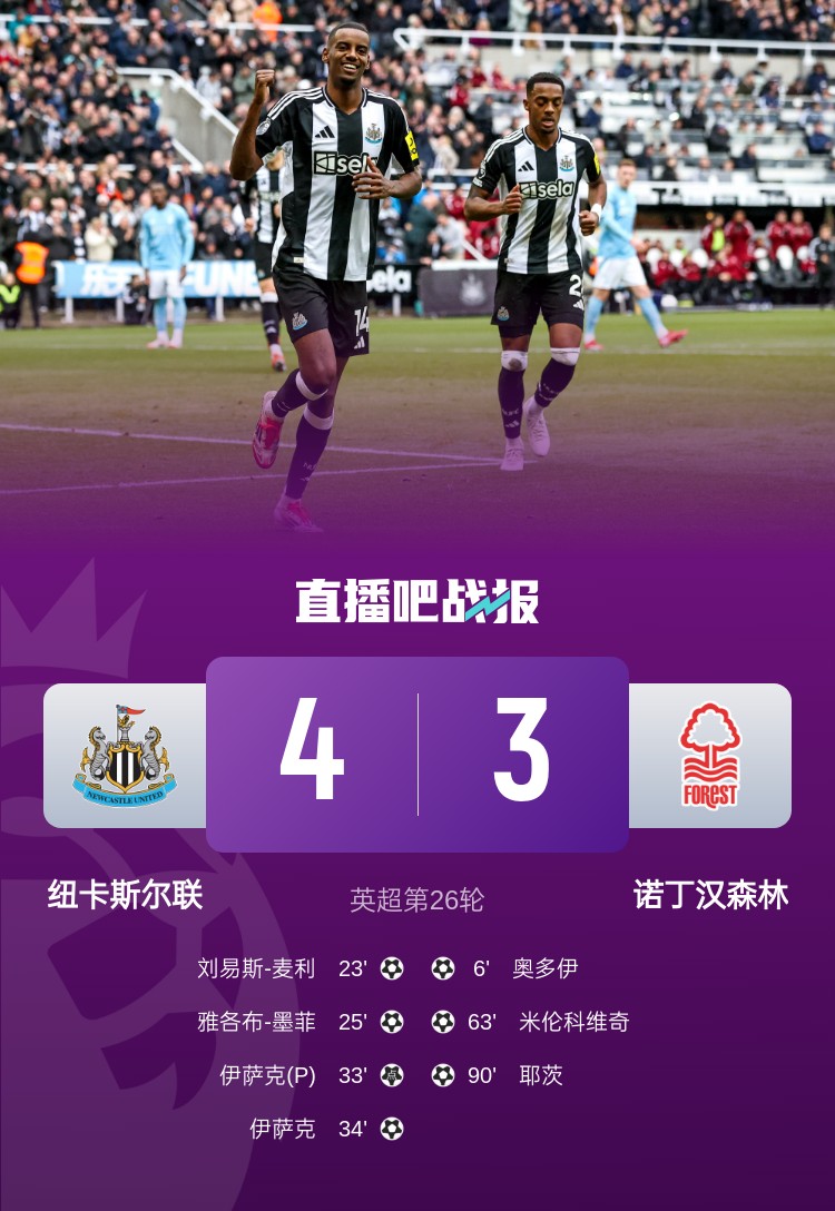 英超第26轮,纽卡4-3诺丁汉森林。上半场,奥多伊前场断球后轰出世界波破门,麦利和墨菲3分钟内连进两球,埃纳手球送点,伊萨克点射得手,随后他梅开二度;下半场,沙尔头球中柱,米伦科维奇蝎子摆尾扳回一球,耶茨补时阶段再追一球。