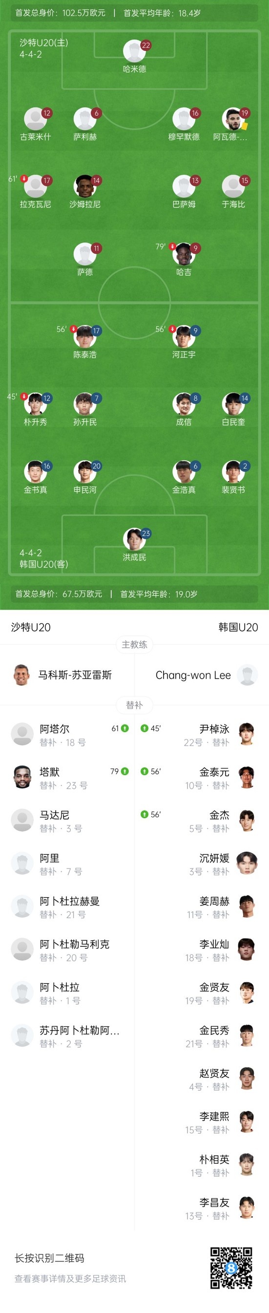 下半场补时3分钟,U20沙特0-0韩国U20。