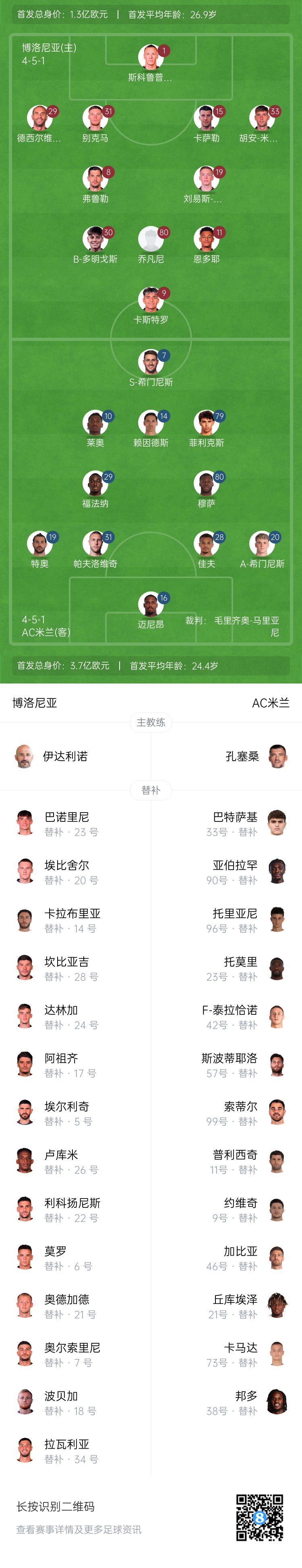 博洛尼亚首发:1-斯科鲁普斯基、29-德-西尔维斯特里、31-别克马、15-卡萨勒、33-胡安-米兰达、8-弗鲁勒、19-刘易斯-弗格森、11-恩多耶、80-法比安、30-本杰明-多明戈斯、9-卡斯特罗
