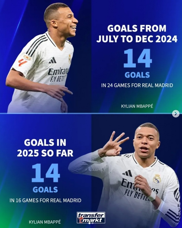 作为对比,姆巴佩在去年7月到12月共计24场打进14球,而进入2025年后16场也打进14球。