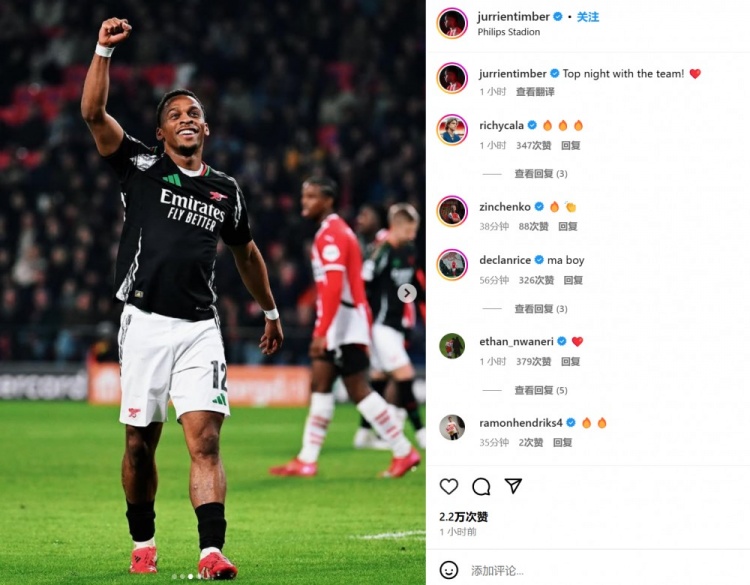 廷伯在本场比赛为枪手第18分钟头球首开记录,他也晒出庆祝照并配文:“全队表现顶级的一晚!”
