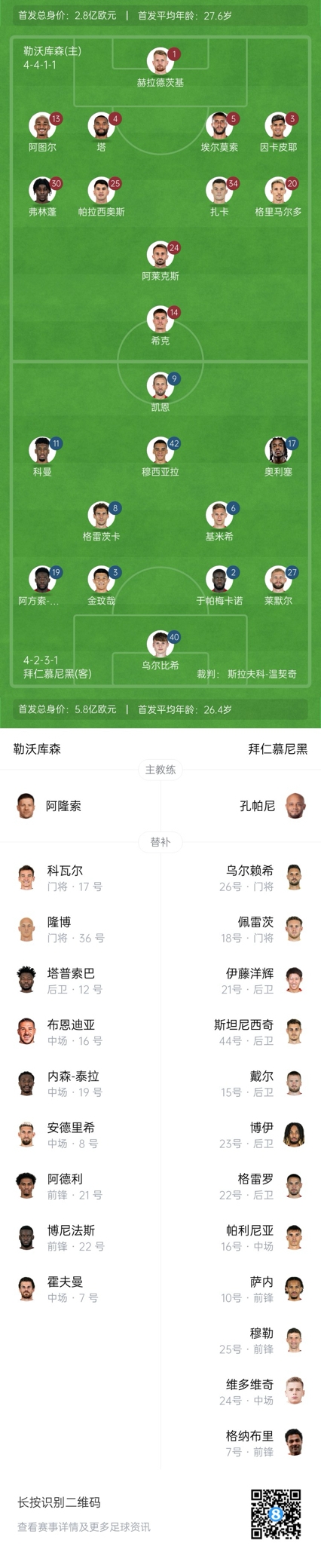 拜仁首发:40-乌尔比希、3-金玟哉、2-于帕梅卡诺、19-戴维斯、27-莱默尔、8-格雷茨卡、6-基米希、11-科曼、42-穆西亚拉、17-奥利塞、9-凯恩