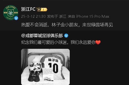 浙江队社媒发文悼念:热爱不会消逝。林子金小朋友,来世绿茵场再见。