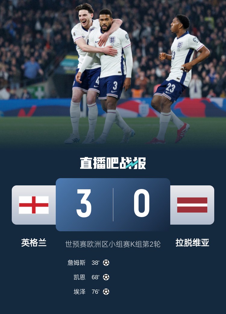 里斯-詹姆斯精彩任意球破门,赖斯助攻凯恩破门,埃泽单兵爆破建功。最终,英格兰3-0战胜拉脱维亚,世预赛2连胜暂3分领跑K组。