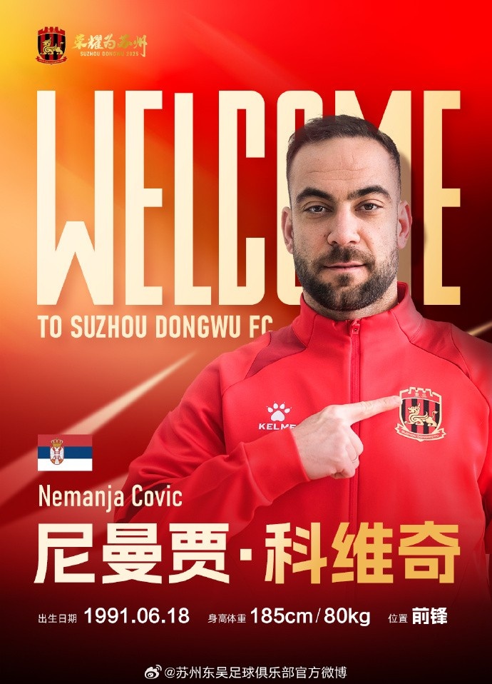 经友好协商并达成一致,球员尼曼贾 · 科维奇、安德烈耶维奇正式加盟苏州东吴足球俱乐部,为苏州东吴出战新赛季各项赛事。
